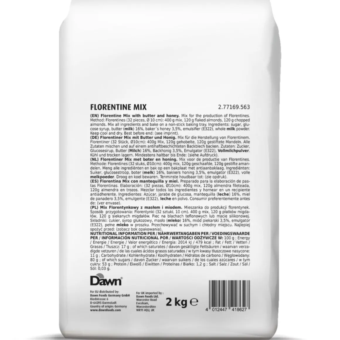 Florentine koekjes zijn heerlijk om bij de koffie te serveren, maar ook ideaal te gebruiken ter decoratie op baksels. De Dawn florentiner mix wordt geleverd in een zak van 2 kilogram.