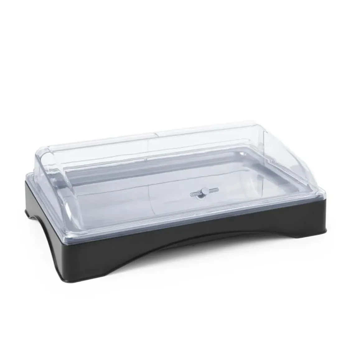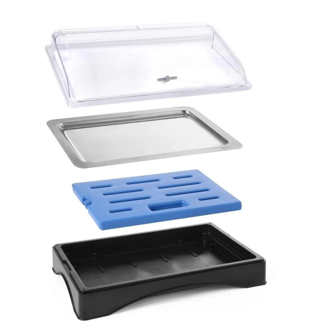 Koeling door bijgeleverd koelelement, voor bereik onder 0°C. Inclusief roestvast staal gastronorm 1/1 serveerplateau. Met transparant polycarbonaat deksel. ABS behuizing.