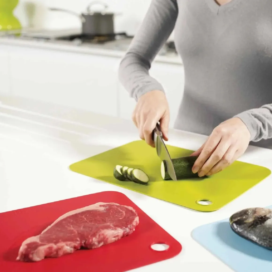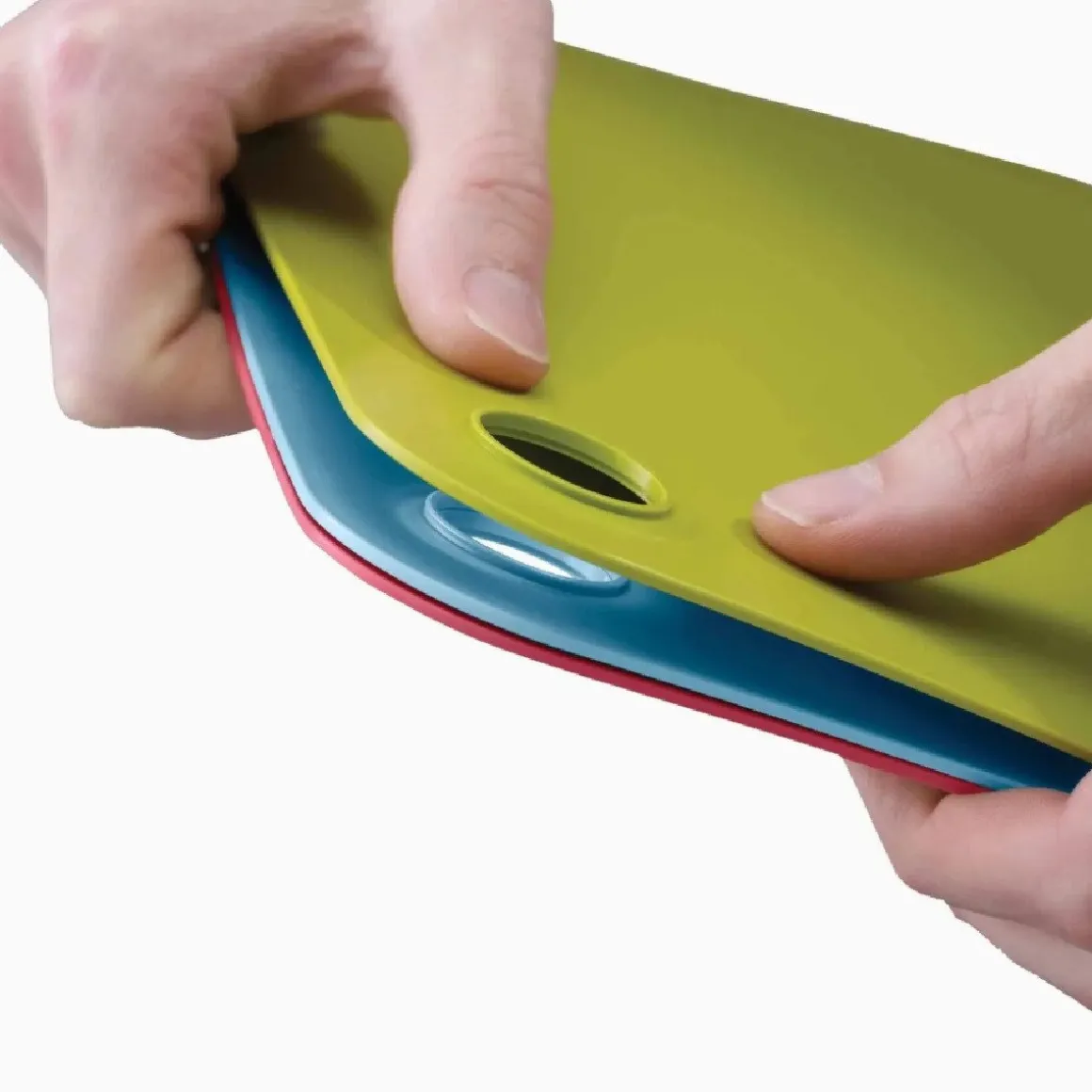 De Joseph Joseph Snijmat 24x34cm Set/3 bestaat uit 3 verschillende kleuren snijplanken: rood, blauw en groen. Deze planken zijn dun en aan beide kanten te gebruiken. Verder nemen ze niet veel ruimte in beslag. De ringen zijn namelijk zo ontworpen, dat de planken in elkaar gedrukt kunnen worden. Daarnaast kun je de ringen gebruiken om de planken op te hangen. Elke plank heeft een afmeting van 24×34 centimeter.