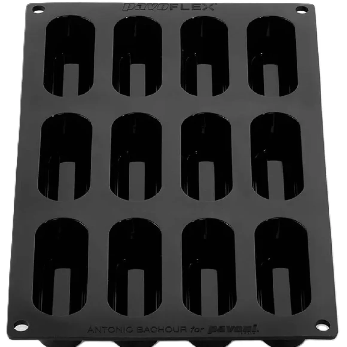 Met de Pavoni Siliconen Vorm Rond 40 80x30mm (12) 30×17,5cm kun je 12 strakke, ovaalvormige creaties van elk 80×30 mm maken. Ideaal voor het creëren van verfijnde 1-persoons lekkernijen.