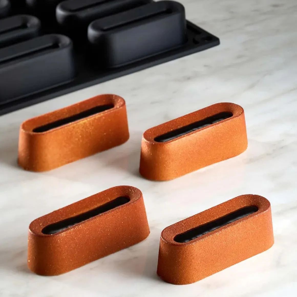 Deze siliconenvorm is geschikt voor het maken van mousses, semifreddo’s, bavarois of gebakken cakes. Door de vormgeving is elk element voorzien van een verdiept midden, perfect om te vullen met een smaak of textuur. Denk aan een kern van frambozencoulis in een witte chocolademousse, of een vulling van passievrucht in een kokosbavarois.