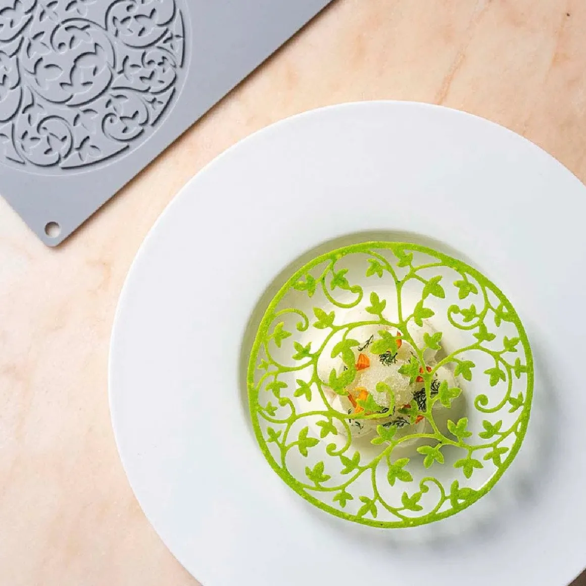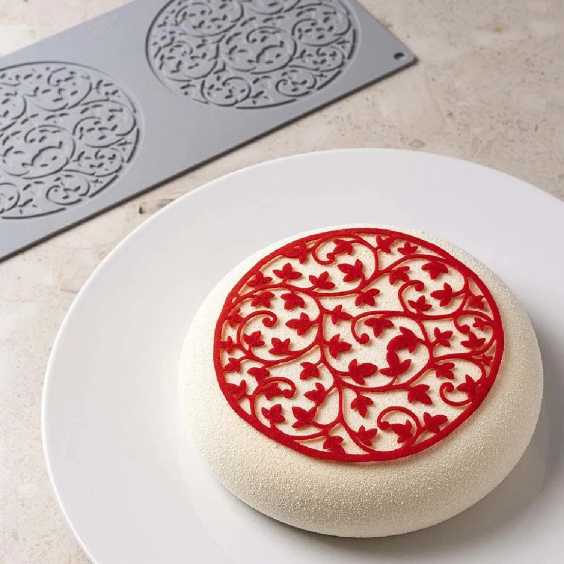 Met deze siliconenvorm creëer je verfijnde decoraties van bijvoorbeeld isomalt, chocolade of krokant beslag. Deze decoraties zijn ideaal als finishing touch op taarten, gebak of voorgerechten. Plaats ze op een moussegebakje, een ijstaart of een creatief gerecht.