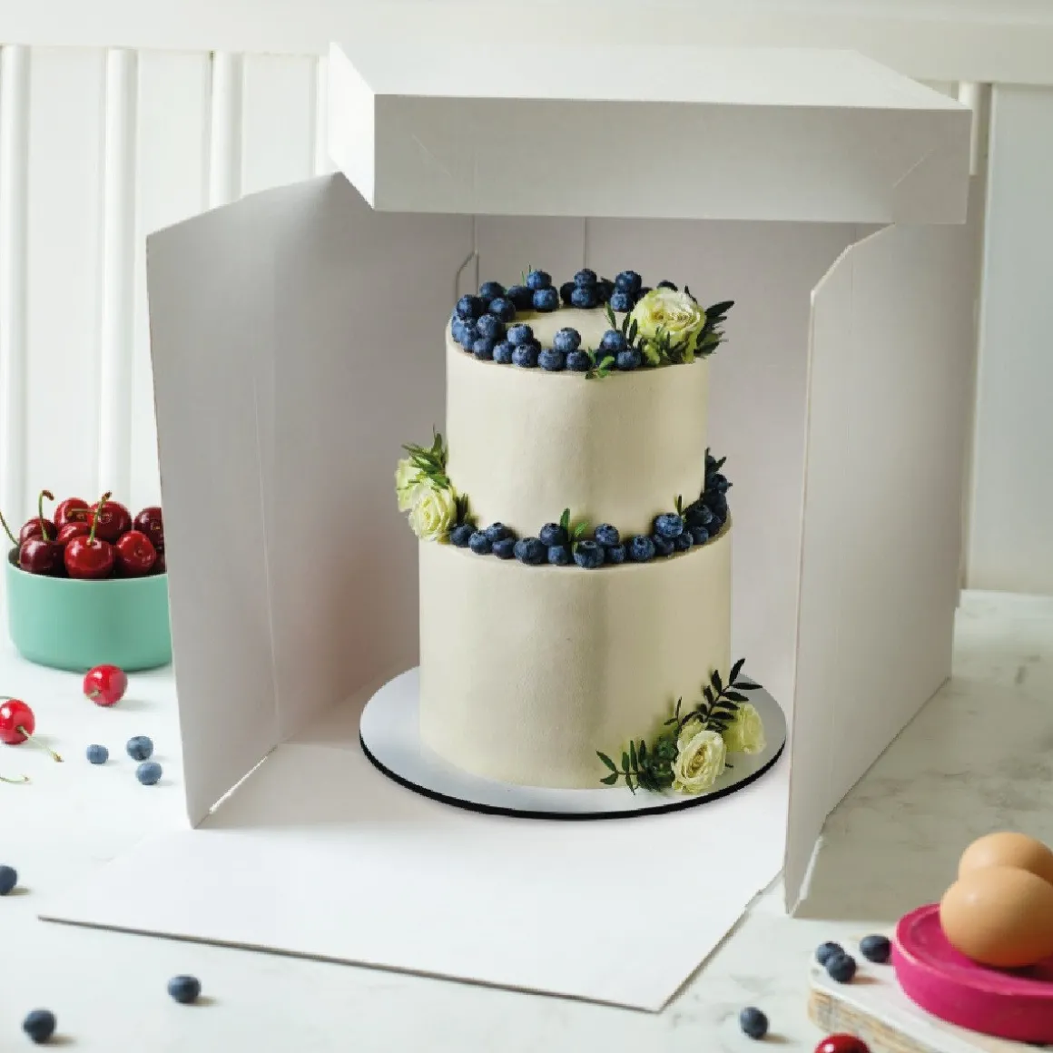 De verpakking bevat een doos en een deksel, die beiden eenvoudig in elkaar gevouwd kunnen worden. Deze zijn vervaardigd uit hoogwaardig, magnetronbestendig materiaal. De box is voorzien van een opening aan één van de zijkanten. Als de deksel eraf is, valt deze kant open. Deze kant is geschikt om de taart zonder te beschadigen in of uit de doos te halen.