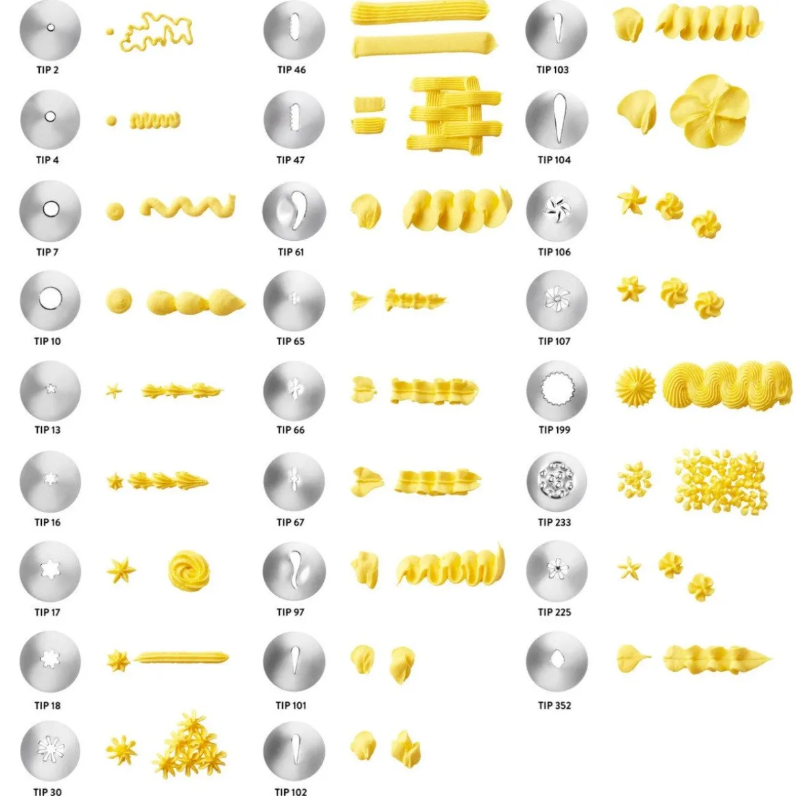 - Spuitmondjes: rond #2, #4, #7, #10 – ster #13, #16, #17, #18, #30, #199 – blad #65, #66,#67, #352 – petal en drop flower #61, #97, #101, #102, #103, #104, #106, #107, #225 – speciale #46, #47, #233